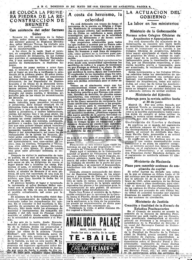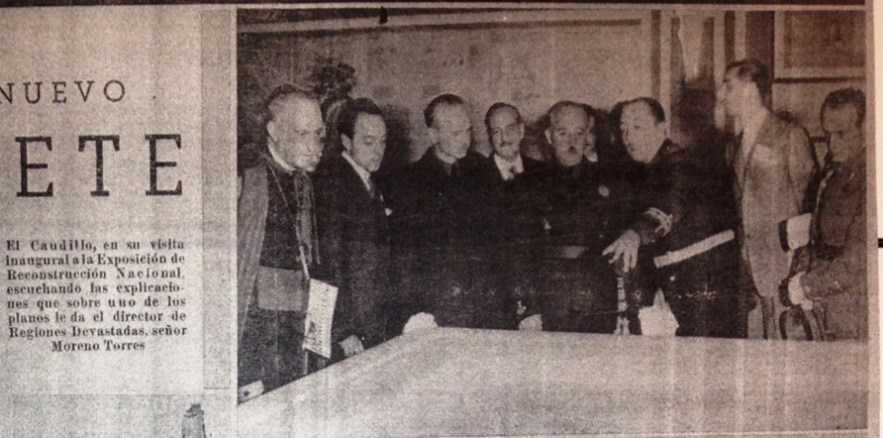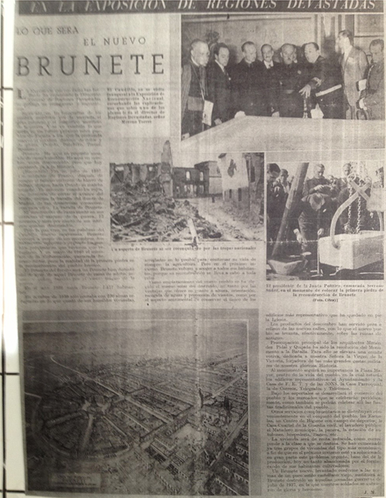 Publicación con motivo de una exposición sobre los trabajos de la recién creada Dirección General Regiones Devastadas incluyen la fotografía de colocar la primera piedra del nuevo Brunete, el día 18 de Mayo de 1940