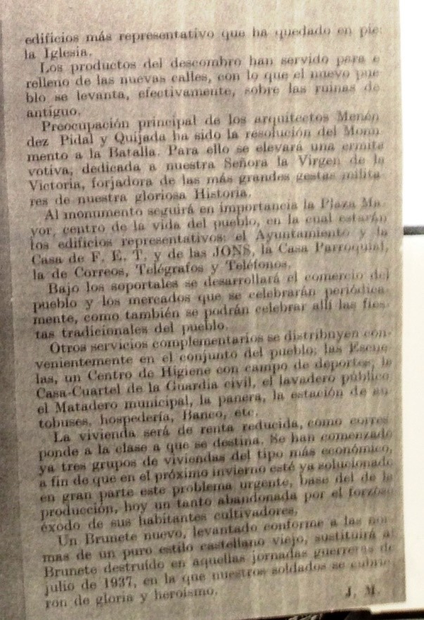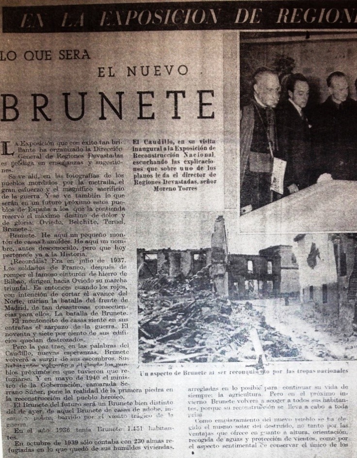 Hace alusión a que Brunete tenía 1451 habitantes y solo quedan ó han regresado 230, con pretensiones de vivir, noticia que se presta a confusión, al dar por hecho que perecieron en la Batalla, sin embargo con motivo de la Batalla solo fueron aproximadamente 20 personas las que murieron al tomar el bando republicano el pueblo, el día 6 de julio de 1937, el resto le dio tiempo a huir hacia Villaviciosa de Odón, Sevilla la Nueva y Navalcarnero donde pasaron el resto de la Guerra y cuando volvieron no había nada más que 4 casas que reparándolas sirvieron para vivir. El invierno de 1940/41 prácticamente solo 5 familias vivieron en el pueblo el resto de personas venían desde Navalcarnero y desde Sevilla La Nueva todos los días a las labores del campo y la mayoría a trabajar en la reconstrucción. Excepto la llamada nave de D. Luis Bahía que había servido de Hospitalillo y al ser de ladrillo y hierro se la pudo reconstruir rápidamente, con fines militares.