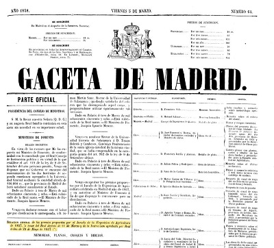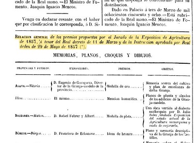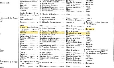 Se presenta a concurso de productos agrícolas y gana una mención con los garbanzos, en 5 de marzo de 1858. Gaceta de Madrid.
