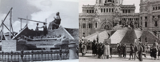 Dos instantáneas de la Cibeles, protegida para la guerra.