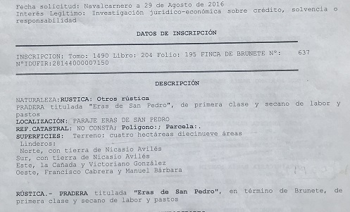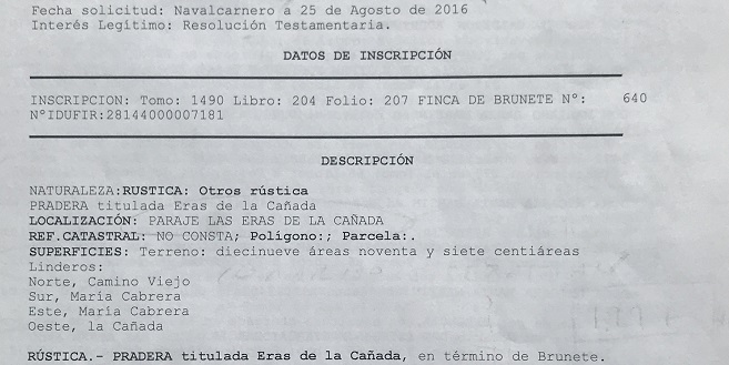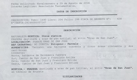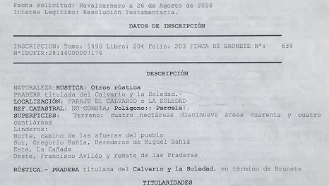 Este estudio no quedaría terminado si no publicamos que las cuatro parcelas subastadas, conocidas como la Eras de Pan Trillar de Brunete, siguen vigentes en el Registro de la Propiedad nº 2 de Navalcarnero a nombre de 56 propietarios, en proindiviso, en los términos de 1875.