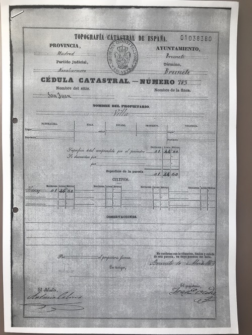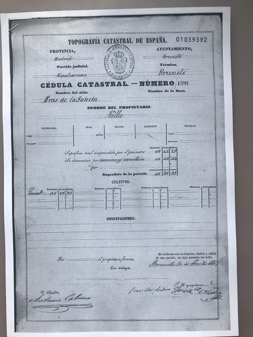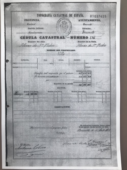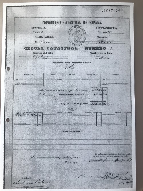 En Brunete, en1866, firma las cédulas de los propietarios como garante de legitimidad el alcalde, Antonio Cabrera.