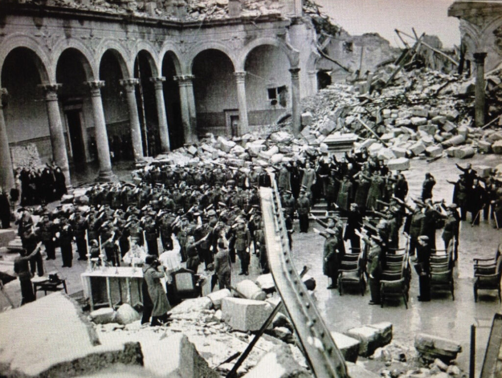 Foto, misa en el patio del Alcázar de Toledo, momento del saludo fascista, invierno de 1939.