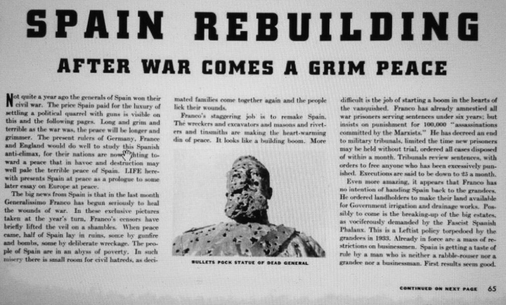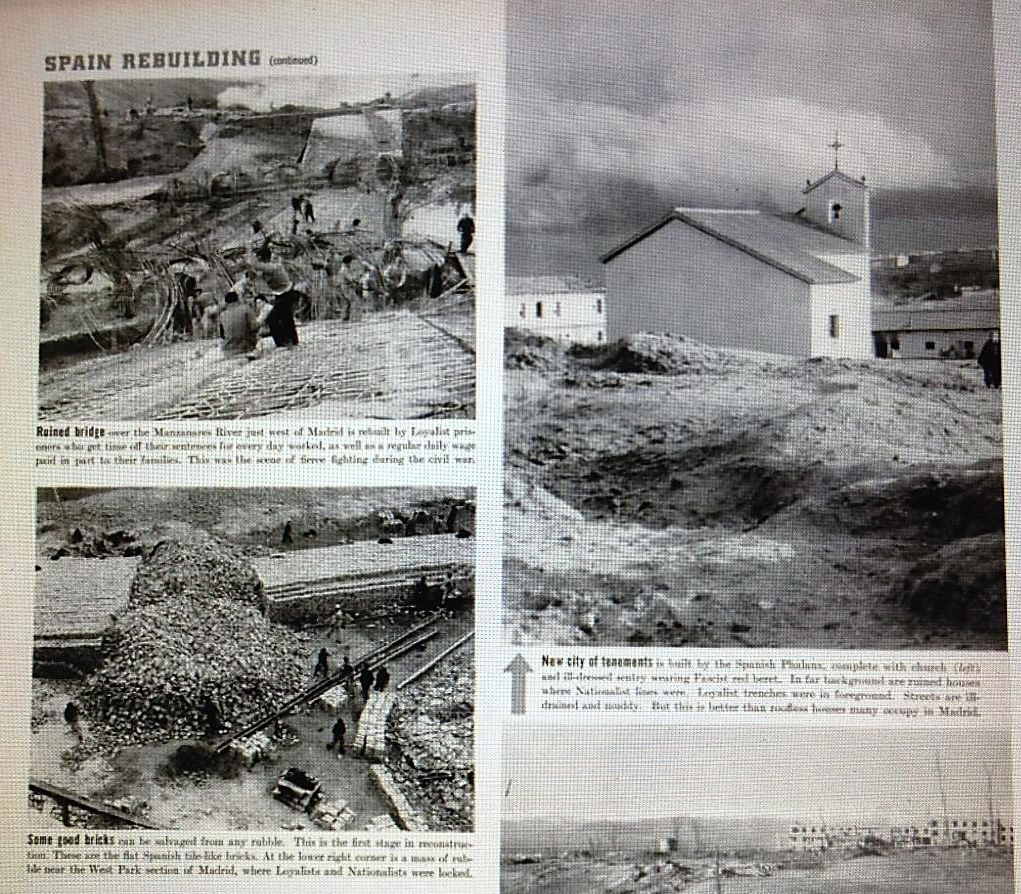 La gran noticia desde España es que el mes pasado el Generalísimo Franco ha empezado a curar seriamente las heridas de la guerra. En estas fotografías exclusivas tomadas a finales de año, los censores de Franco han sucintamente destapado el velo del desastre.