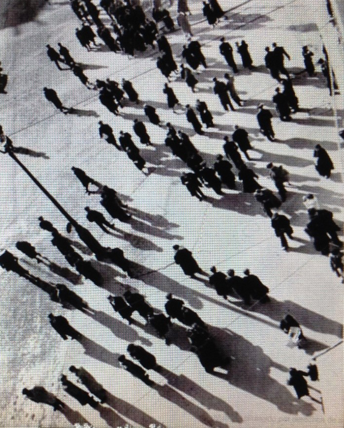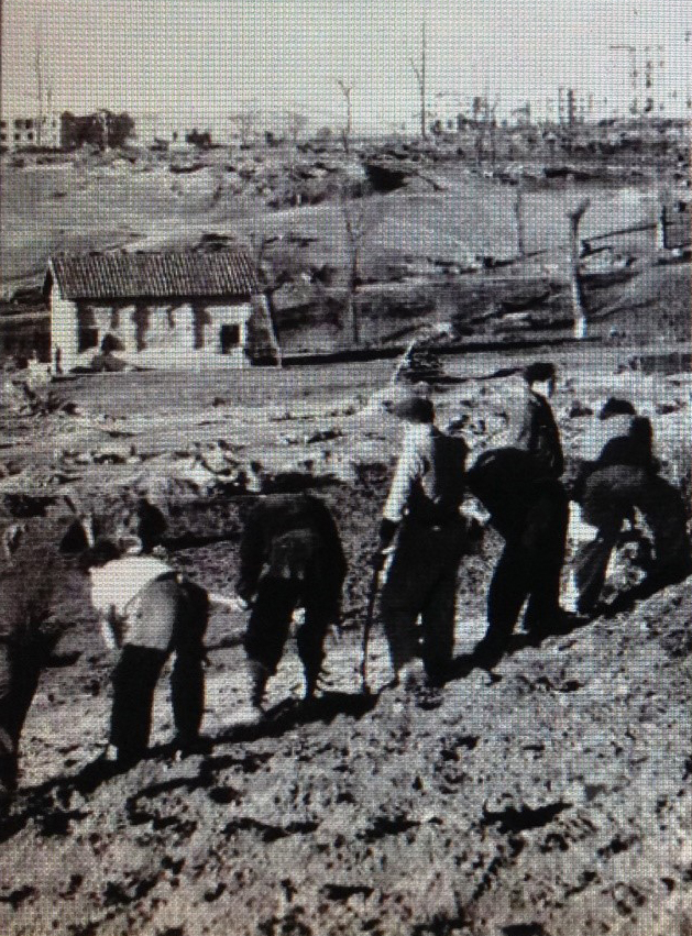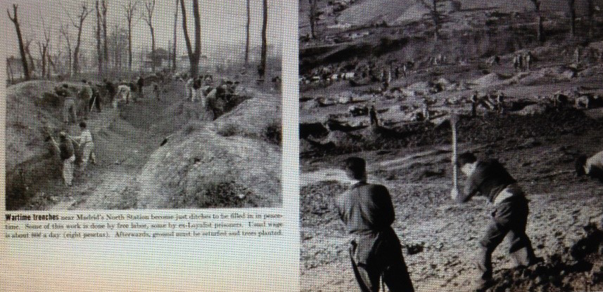 Trincheras de la época de guerra cerca de la Estación del Norte de Madrid, se han convertido en zanjas que son rellenadas en tiempo de paz. Algunos de estos trabajos son realizados por trabajadores libres, y otros por prisioneros ex-republicanos. La paga diaria es de ocho pesetas. Después, el terreno debe ser repoblado con hierba y se plantarán árboles.
