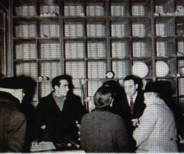 Los compradores se enfrentan a las estanterías vacías de las tiendas madrileñas. Esta tienda de electricidad está llena de clientes, pero vacía de existencias. Visibles dos pantallas de cristal. La guerra vació las estanterías de productos.