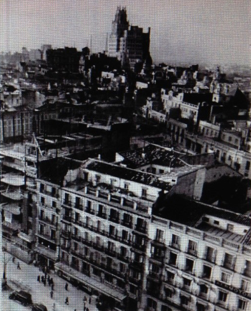 No más bombas en Madrid. La vista de Madrid y el edificio de Telefónica ( cuyo control están ahora tratando de recuperar su gerentes americanos ) muestra cómo el corazón de la ciudad escapó a la devastación y los estragos de los bombardeos. En el fondo a la izquierda, un edificio en reconstrucción.