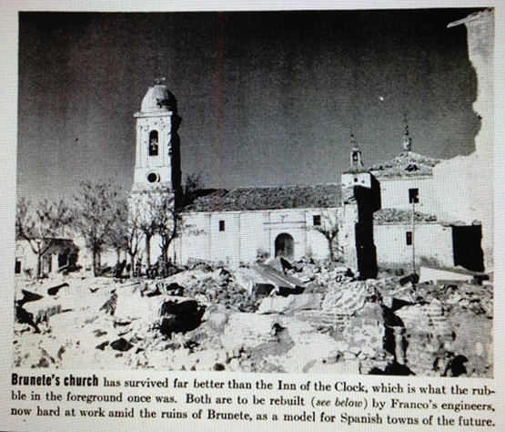 La iglesia de Brunete ha sobrevivido mucho mejor que la torre del reloj, que ahora esta reducida a los escombros que se ven al fondo. Ambas serán reconstruidas ( véase mas abajo) por los ingenieros de Franco, que se encuentran ahora trabajando duramente entre las ruinas de Brunete, para convertirla en un modelo para las poblaciones españolas del futuro.