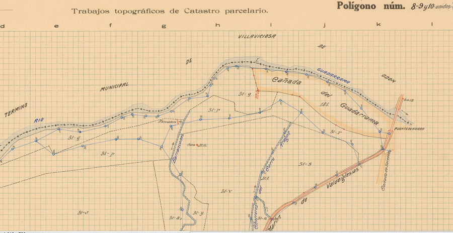 - Continuando en la lógica como documento más antiguo tenemos el plano del Catastro en el que indica– PUENTE DE HIERRO– prácticamente en el inicio del camino de Sacedon, que comunicaba con La Cañada de Guadarrama, en otros mapas indica; descansadero. Lo tenemos reseñado en las fotos aéreas de 1956, como camino de Bacares, esta finca es previa a Sacedon y curiosamente sigue en la actualidad.