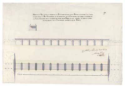 Dos proyectos alternativos del Puente de Brunete sobre el río Guadarrama. El primer proyecto es de once arcos de medio punto en piedra de sillería en sus pilares, y tajamares y pretil rematado por bolas de herencia herreriana. Los tajamares tienen perfil apuntado por uno de sus lados y redondeado por el contrario. El segundo tiene trece huecos y está concebido en madera a excepción de sus pilares y tajamares, de fábrica y de perfil apuntado a ambos lados. Ambos fueron planteados para sustituir un puente de madera anterior. Los firma el profesor, académico y teniente mayor de las obras de Madrid, Mateo Guill.