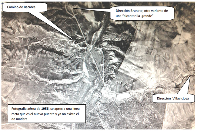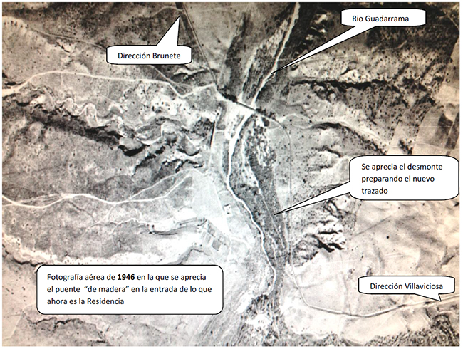 Sin embargo, en esta cuestión la documentación que obra en mi poder desmiente rotundamente tal teoría. En efecto, dispongo de un plano y de casi todo el proyecto, y aparece reflejado muy claramente en ambos documentos que el ferrocarril cruzaría por el vado de Sacedón, casi 800 m aguas abajo (actualmente se aprecia igualmente el lomo donde partiría el puente). Por otro lado, hay fotografías aéreas de los años 1946 y 1956 en las que se ven -a la salida de Villaviciosa a la izquierda, en dirección recta a la futura estación de Sevilla la Nueva, que no era otra que Sacedón- los desmontes para la vía en una línea recta. En ambas fotografías se aprecian tanto la zona del puente «de madera» como la del puente actual.