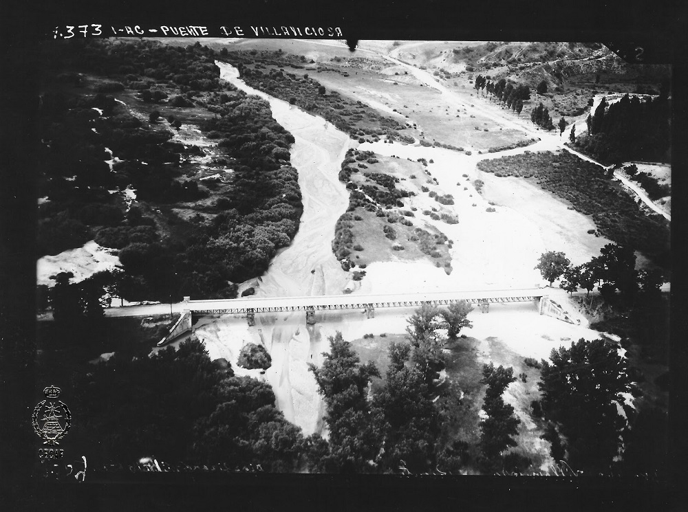 - Por último la fotografía aérea, se ve el puente desde lejos, puede ser realizada con motivo de una crecida, como se aprecia, el rio y arroyos desbordados. En los años 1920 al 1930 el Ejercito del Aire hacia vuelos de reconocimiento y entrenamiento en fotografía aérea, como las hay de distintos pueblos y zonas próximas a la Aeródromo de Cuatro Vientos.