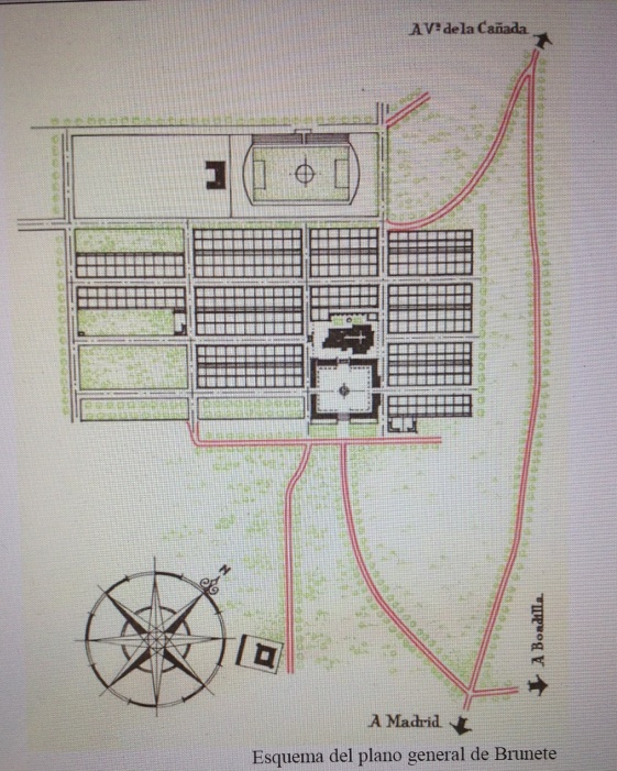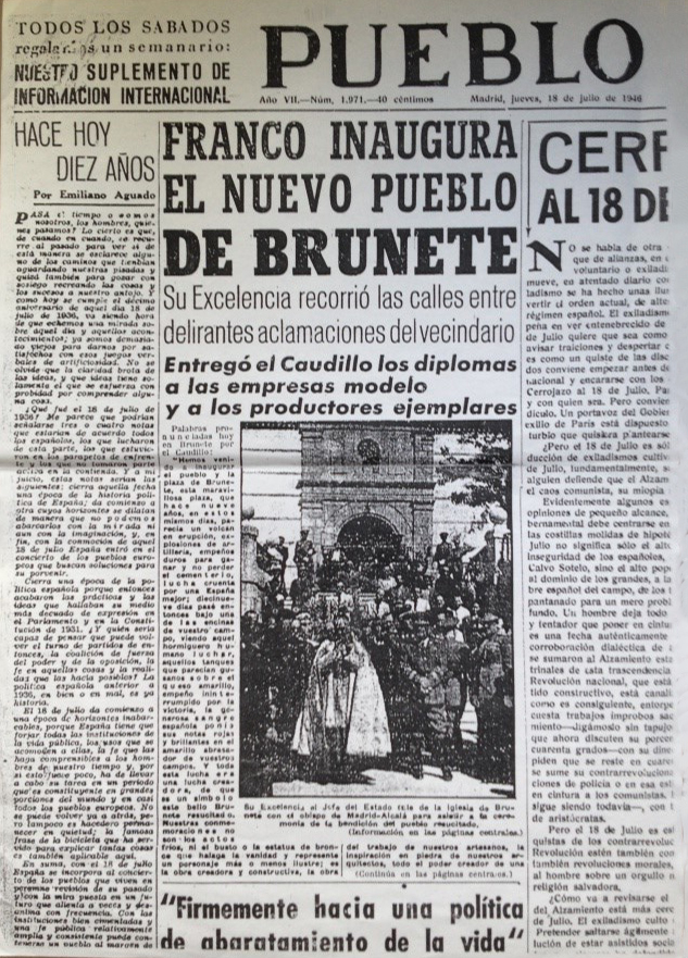 Sería el 18 de julio de 1946 cuando volvió de nuevo a Brunete para inaugurar el pueblo oficialmente y ya estaba construida, la Plaza, La Iglesia y las manzanas de casas que vemos en el plano.