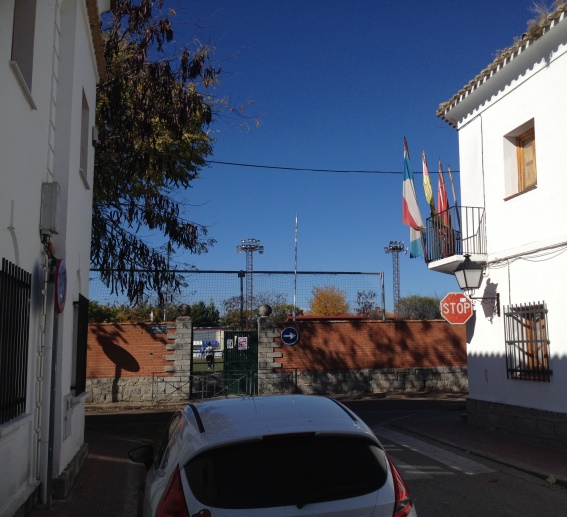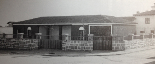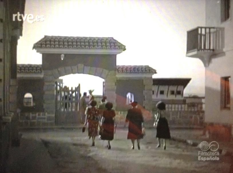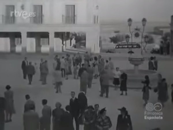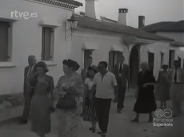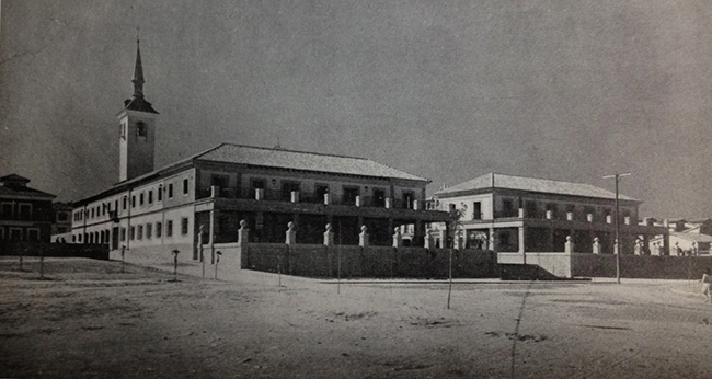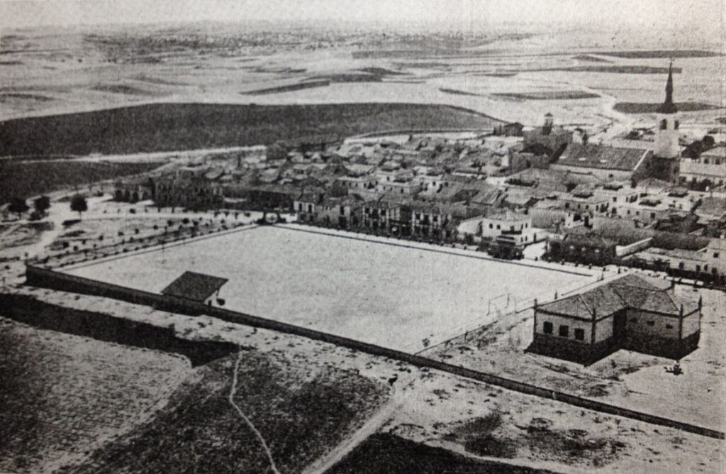 Fotografia tomada desde la portada del campo de deportes y grupo escolar, el día de la inauguración se aprecia a la derecha lo que inicialmente fue centro de salud con hall en arcos abierto a modo de porche que posteriormente se modificó varias veces hasta ser en la actualidad la entrada a la biblioteca.
