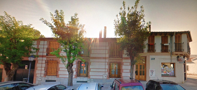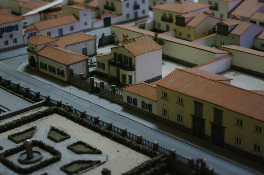 Fotografía tomada de la magnífica maqueta existente. Se aprecia el arco en el hall del recibidor de la consulta del médico y su vivienda de dos plantas que no se llegó a realizar retranqueada, sino en línea con la fechada y de una planta.